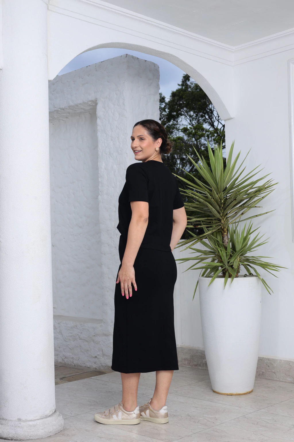 A blusa feita mesmo em corte universal, veio cheia de sofisticação, com manga curta e modelo basico dando para usar no dia a dia. Para completaro combo a saia é midi, possui dois bolsos funcionais e também uma amarração fake. Adepta a varias combinações.